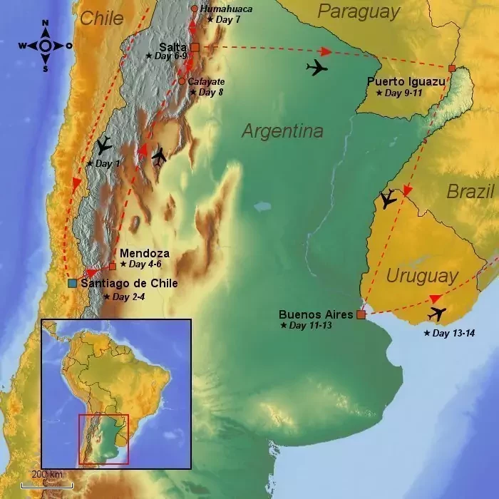 This trip is packed with visits to wonderful towns and magnificent, varied countryside, with the colourful Andes Mountains, deliciously scented vineyards and giant waterfalls as the backdrop. The tour starts in the Chilean capital, Santiago de Chile, where tall skyscrapers and modern architecture contrast sharply with charming, historical buildings. You then move on to Argentina, where you will visit the famous wine-producing regions of Mendoza and Cafayate for a thorough introduction to the whole process. You will visit the delightful town of Salta, with its well-preserved colonial buildings, and the Humahuaca and Conchas Gorges, famous for their geological rock formations in a host of colours. One of the absolute highlights is without a doubt your visit to Iguazú Falls, which are set in an area of rainforest comprising a rich variety of flora and fauna. The journey ends in the Argentine capital Buenos Aires, which many people call South America’s answer to Paris. Here you will visit all the best-known sights and attractions, and will have the chance to experience an authentic Argentine tango show before heading back home.