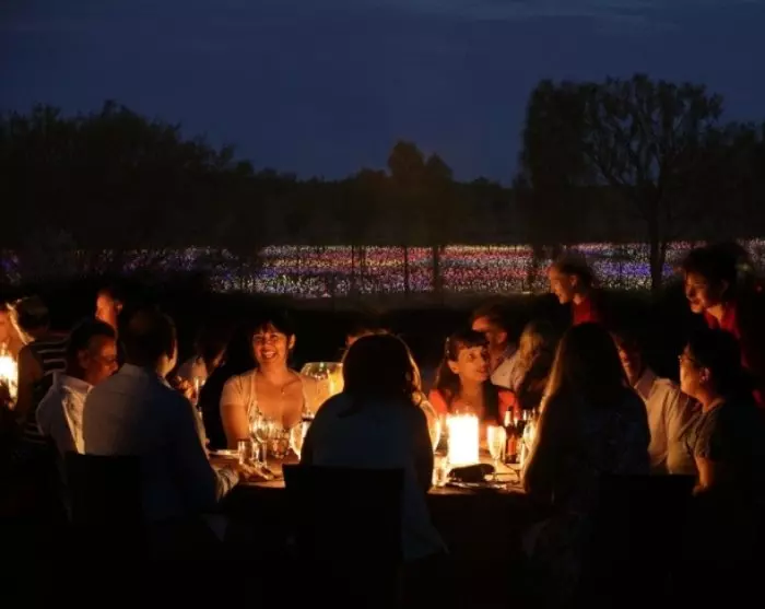 The evening starts with a glass of bubbly in the sunset, while the lamps turn themselves on one by one. It’s always kind of wistful when the sun goes down behind Uluru, but today there’s a reward for the sunset. Enjoy a three-course dinner, served buffet style, before taking a stroll in the Fields of Light. Please note that dining is at large tables with approximately 10 guests at each table.
