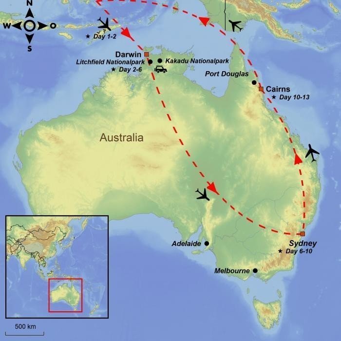 You end up in Cairns in tropical North Queensland. As in Darwin, the months from May-October are synonymous with the dry season, so the temperature is also pleasant here, with low humidity. Discover the world’s largest coral reef, the Great Barrier Reef, or go on a search for the world’s third largest bird in the rainforest north of Cairns.