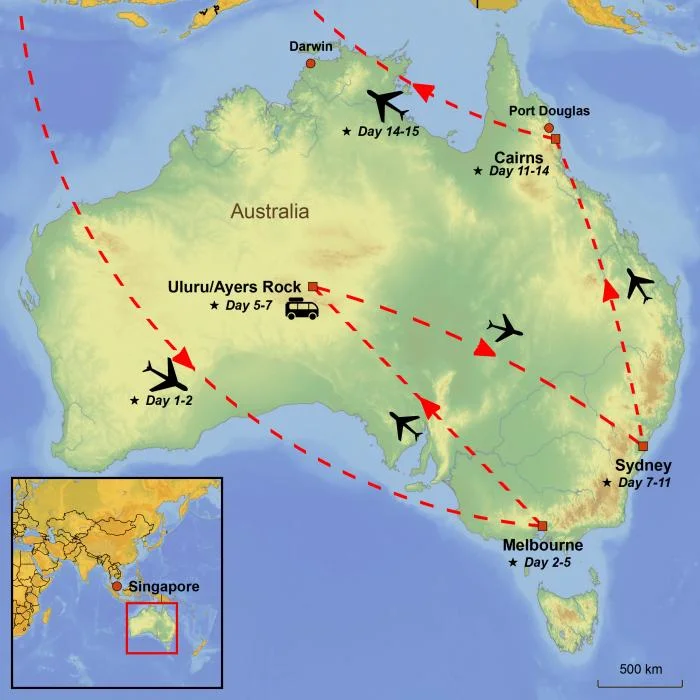 • Domestic flight from Melbourne to Uluru/Ayers Rock + Uluru/Ayers Rock to Sydney + Sydney to Cairns