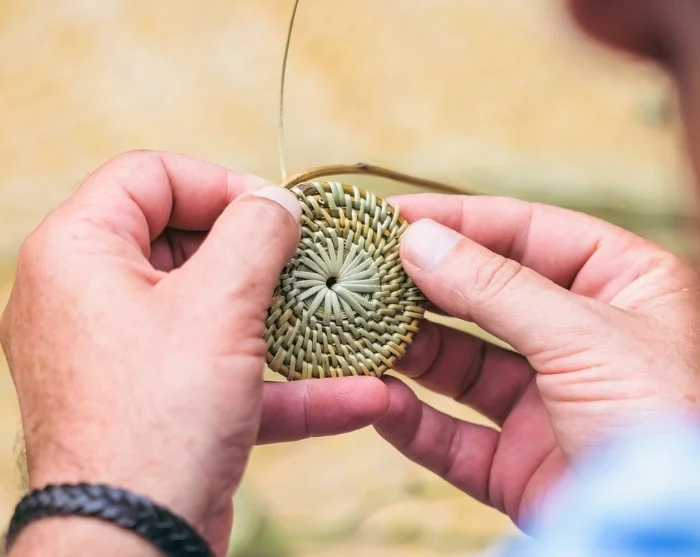 The work uses hata wood, a vine-like and flexible fibre that has been used in Balinese weaving for centuries. With patient guidance, you’ll learn to prepare the fibres by peeling, drying, and softening them before you begin the weaving itself. The calm, repetitive motions create an almost meditative atmosphere, allowing your focus to settle naturally on the process.