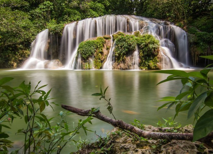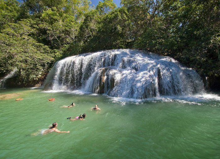 before taking you on a guided walk through the lush woodland around the Rio Mimoso River, passing 9 waterfalls of various shapes and sizes. Along the way, you can swim under the waterfalls and in natural pools, explore small caves and look out over the Serra da Bodoquena with its waterfalls and mountains that form the valley around the Mimoso River. If you feel daring, you can jump from a 6-metre-high bridge into a natural water hole. On some stretches, you can also go on a short boat ride and relax while enjoying the surroundings.