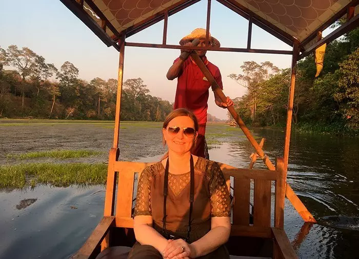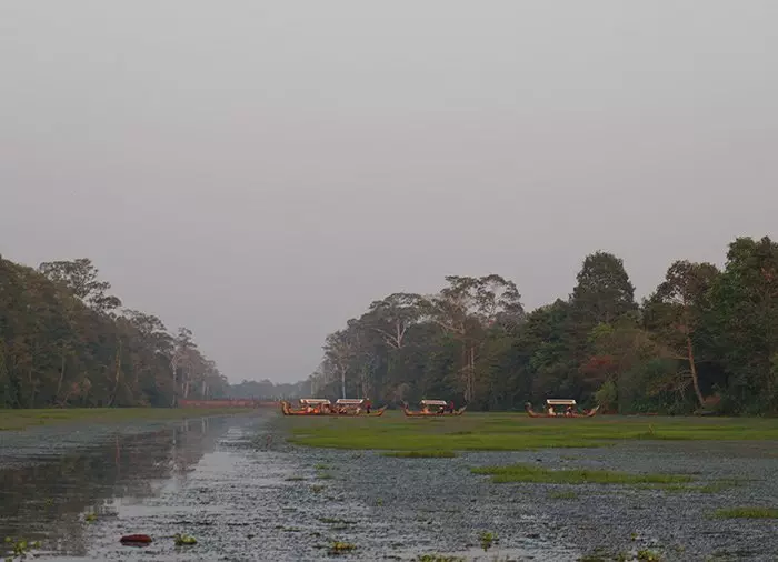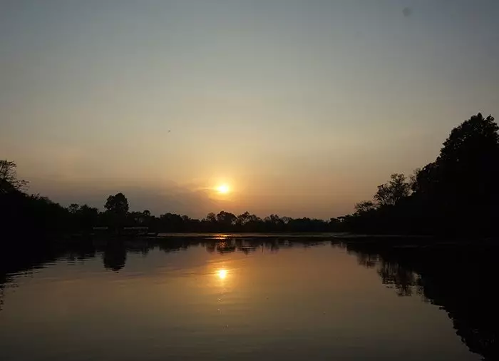 A sense of calm settles over you as you serenely conclude your day with a beautiful boat ride in a gondola, enjoying the sunset at Angkor Thom with a small refreshment on-board. You ride over the very wide moat that encircles all of Angkor Thom, with lush vegetation growing on each side. This is where the locals take a combined evening dip and fishing trip. You are picked up at your hotel and are driven back after the boat ride.