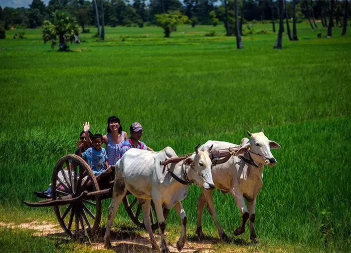 The boat continues to the small village of Chansar, where it is replaced by an ox-drawn cart. You enjoy a fun, bumpy ride through the fields to the home to a local Khmer family who make their living from making brooms. You get to see how they make the brooms, and you might also want to help make one.