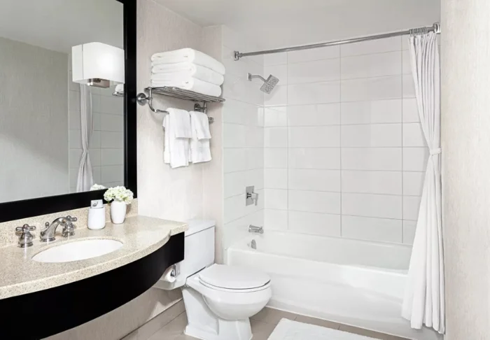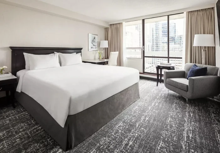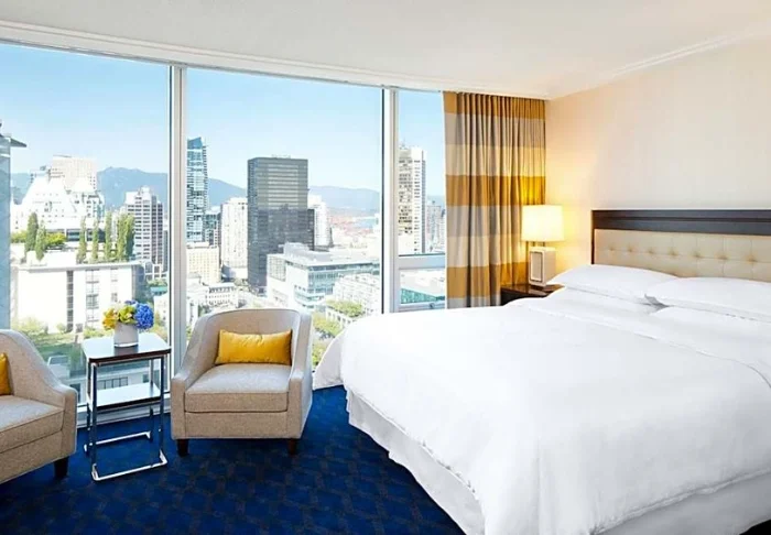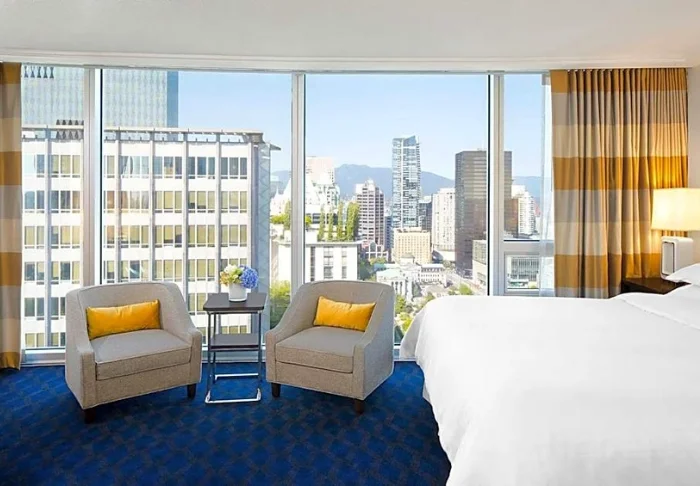 Sheraton Wall Centre features more than 700 stylish rooms, each benefitting from large floor-to-ceiling windows that flood the space with natural light. Interiors are modern and bright, decorated in subtle tones with elegant furnishings. Every room is equipped with a TV, air conditioning, a mini-fridge, tea and coffee facilities, and a private bathroom.