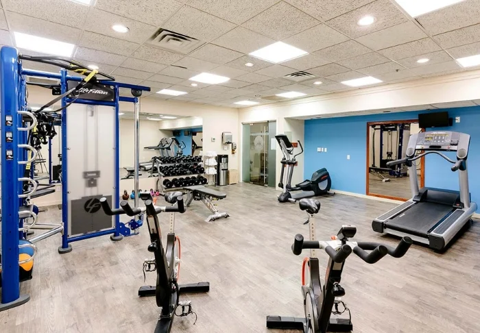 If you prefer to stay active, there’s also a compact fitness room available for guests.