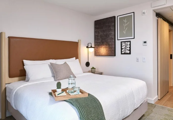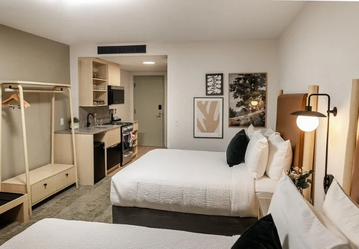 The hotel offers 201 rooms, blending modern design with simple yet stylish interiors. Each room is equipped with amenities such as a TV, complimentary Wi-Fi, a coffee machine, a mini fridge, a desk, and a private bathroom featuring a modest selection of organic toiletries and a hair dryer.