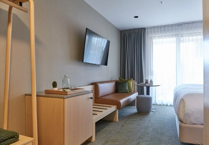 The hotel’s rooms are modern in design, featuring warm hues and natural materials, and are furnished in a simple, functional style. All standard rooms include amenities such as a TV, complimentary Wi-Fi, a coffee maker, a kettle, and a private bathroom.
