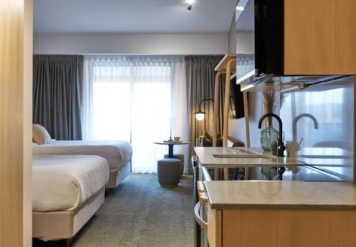 The hotel’s rooms are modern and feature warm tones, natural materials, and a simple, functional design. Each room is equipped with a TV, complimentary Wi-Fi, air conditioning, a coffee machine, an electric kettle, a microwave, a mini-fridge, and a private bathroom with either a shower or bath.
