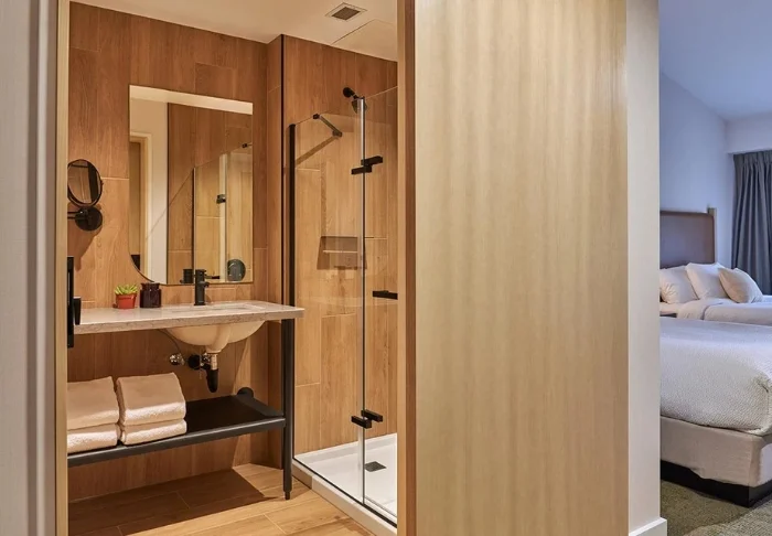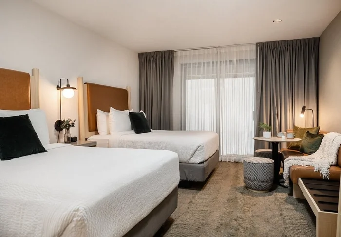 The hotel boasts 99 rooms, all decorated in classic Canadian style with wooden furnishings, calm colours, and a warm, inviting atmosphere. Every room includes amenities such as a TV, complimentary Wi-Fi, air conditioning, a coffee maker, a mini fridge, and a private bathroom.