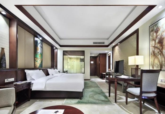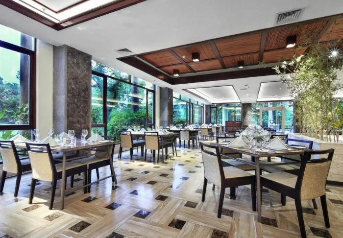 The resort’s restaurant serves both Chinese dishes and simple international classics. You can choose between indoor and outdoor seating, and many prefer to sit outside to enjoy views of the garden and the surrounding mountains.