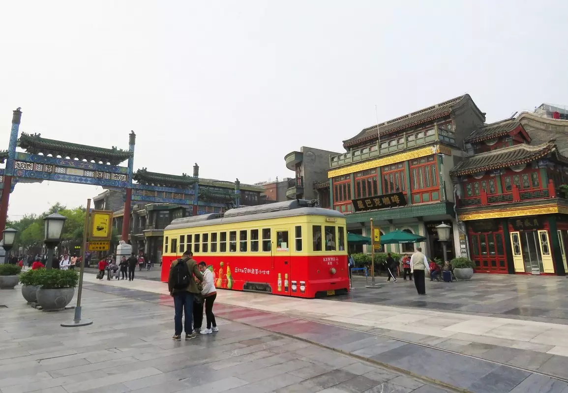 You walk from the hotel to the 840-metre-long shopping street, Dashilan. Founded during the Ming dynasty more than 600 years ago, Dashilan is one of the oldest shopping streets in the city. One of the attractions of the street is the old-style tram that stands at the northern end of the street.