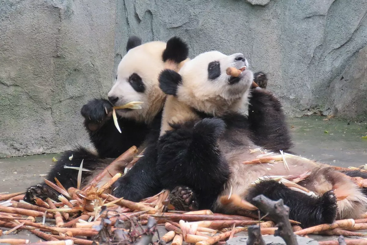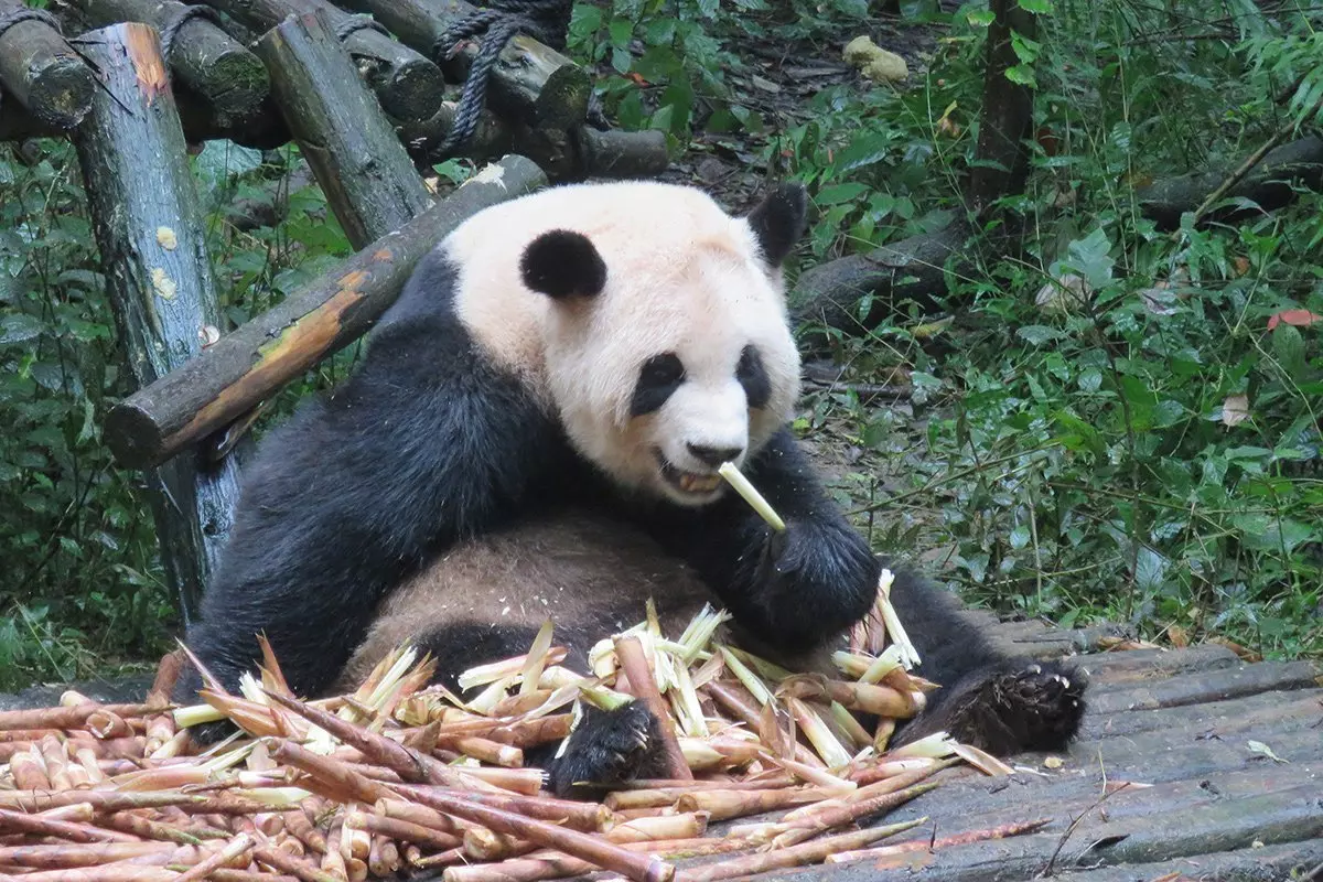 The panda spends up to 15 hours a day eating. There is not a lot of nutrition in bamboo, so an adult panda needs to eat between 15 and 20 kg a day to survive. That is why the adult pandas seem lazier than the others, just lying around sleeping or eating, while the younger pandas spend more time playing and teasing each other.