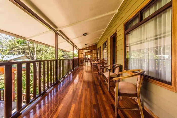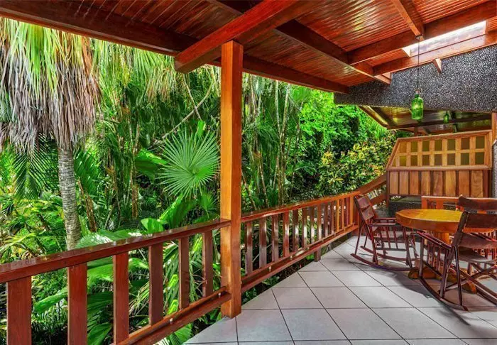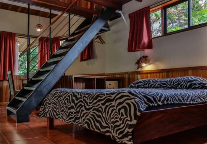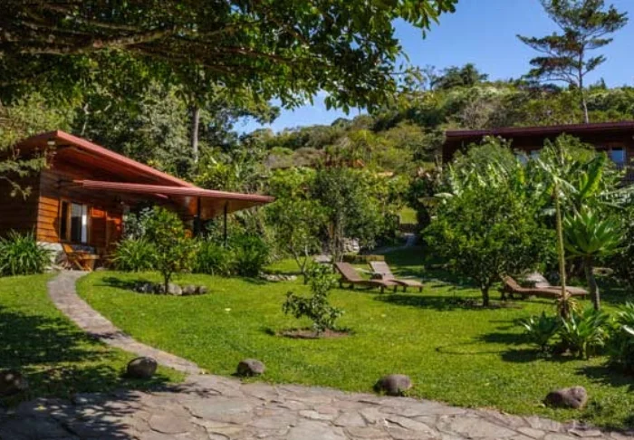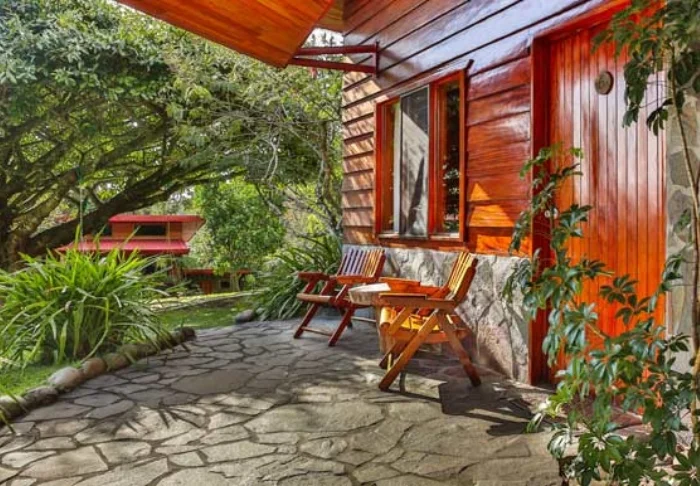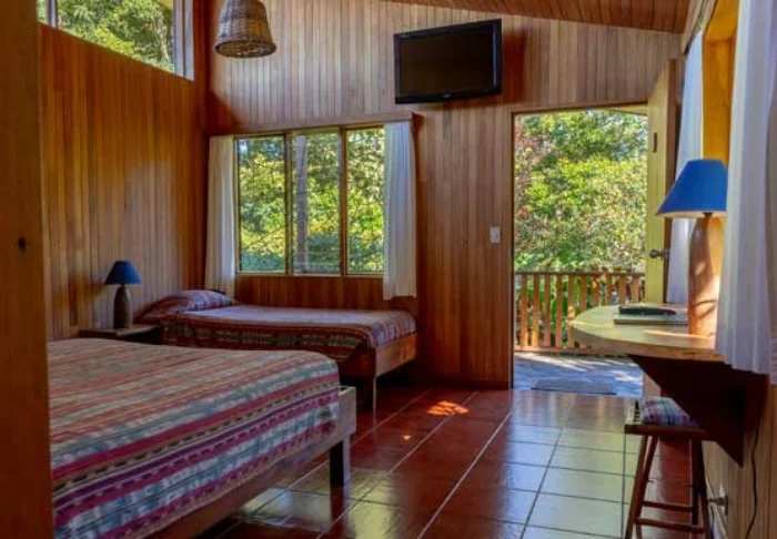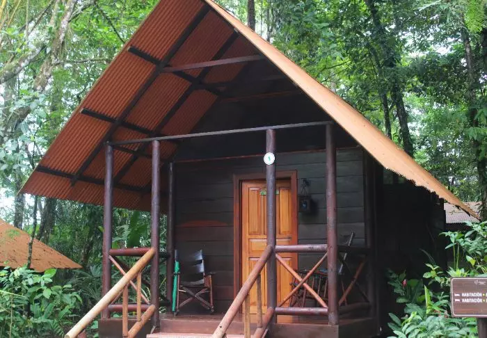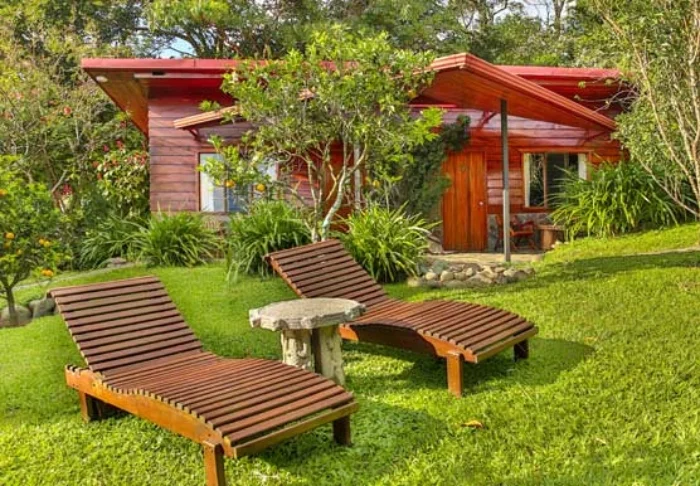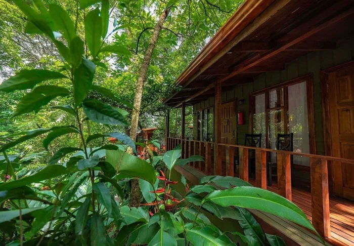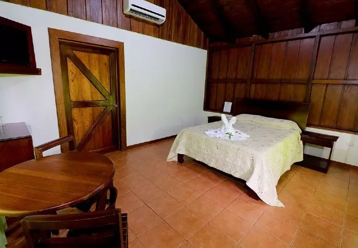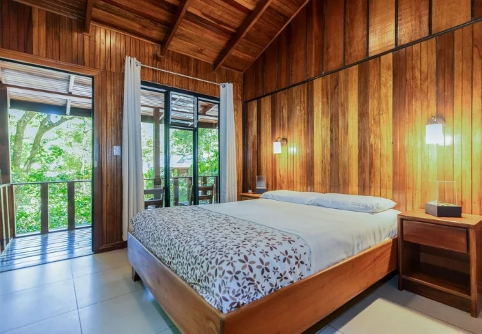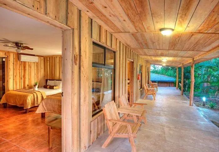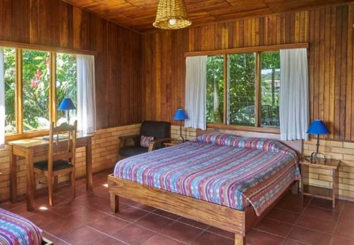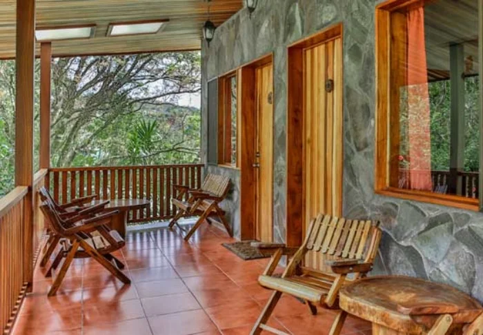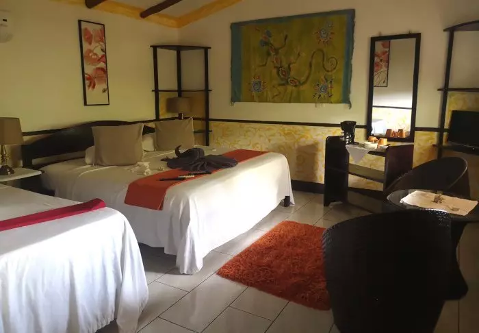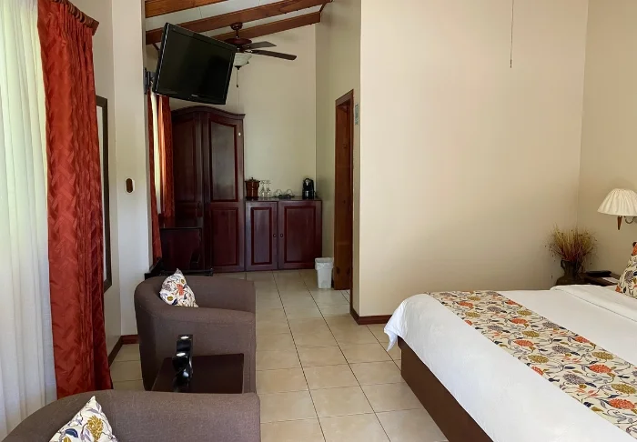 Its rooms are primarily made of wood and decorated in natural colours with green hues. All rooms have air conditioning, cable TV and a mini fridge as well as an en suite bathroom with a hair dryer. Each room also has its own small covered veranda with a couple of chairs where you can relax and enjoy the lush surroundings – and perhaps even spot a colourful butterfly or a hummingbird.