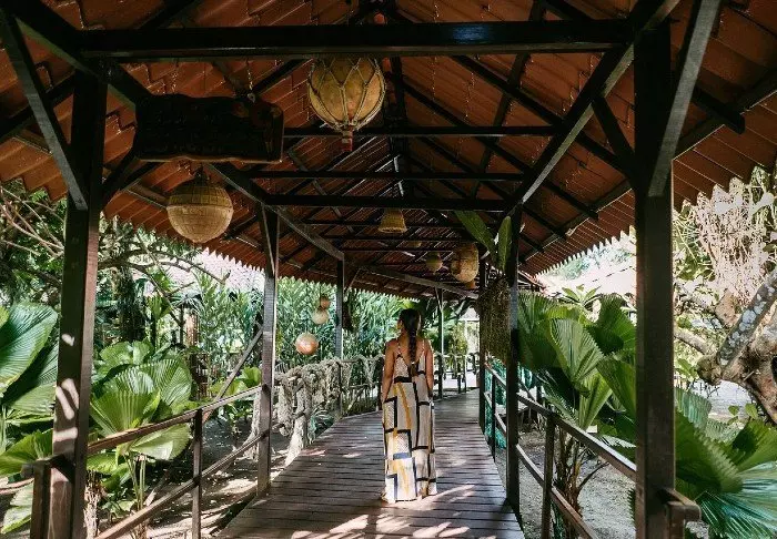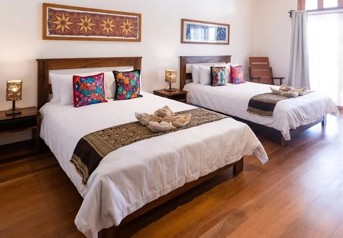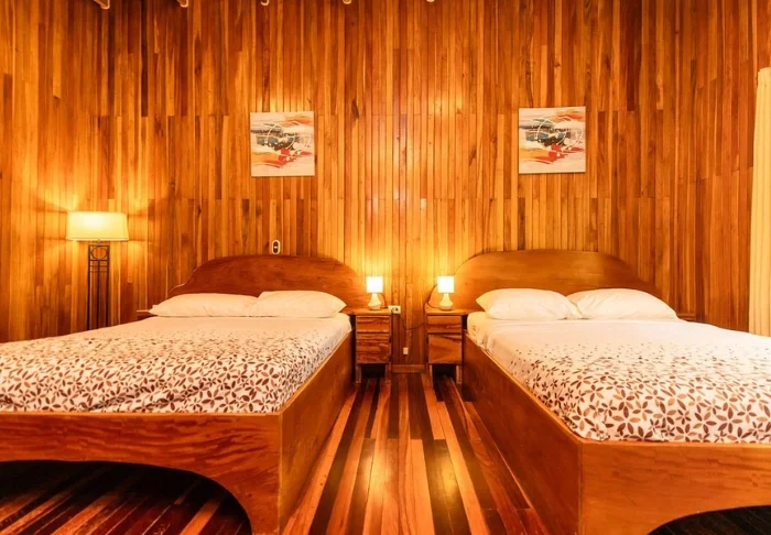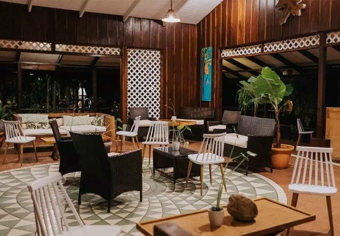 The lodge has just 13 rooms, creating a cosy, intimate atmosphere where you’ll quickly feel at home. Rooms are simply furnished and built using natural materials such as wood and stone, blending beautifully with the surroundings. All rooms have a private bathroom, a fridge, a ceiling fan, and large windows with insect screens, allowing the tropical breeze to circulate naturally through the room. There is deliberately no air conditioning in the rooms, as the hotel prioritises sustainability and natural ventilation, and the high ceilings combined with the breeze keep the rooms comfortable and airy.