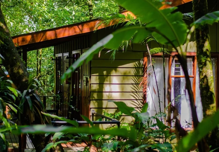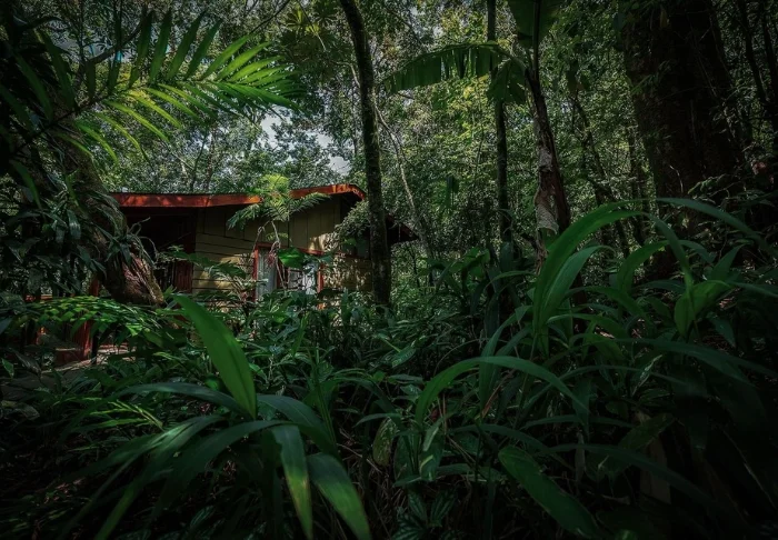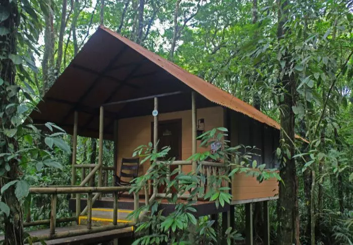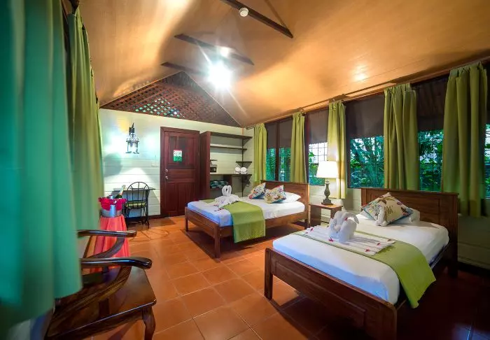The lodge has 33 spacious bungalows, all equipped with ceiling fans and en suite bathrooms with hot water. The rooms are decorated in a tropical style with wooden furniture and colourful prints that harmonise with the lush rainforest right outside your window.
