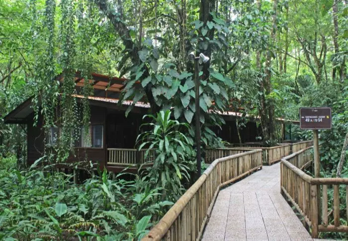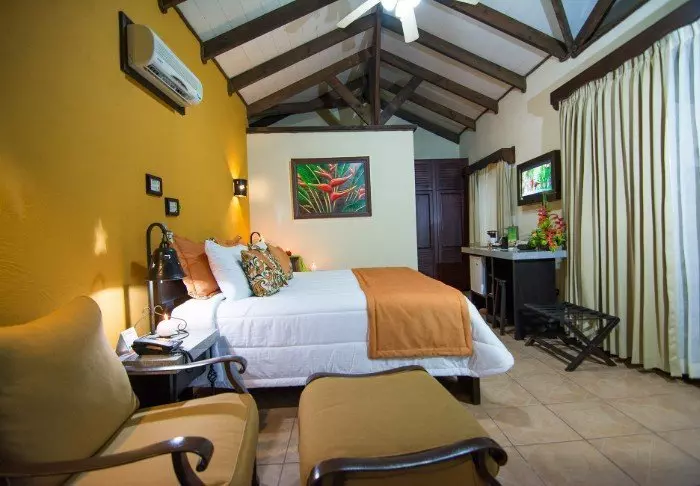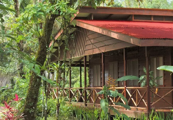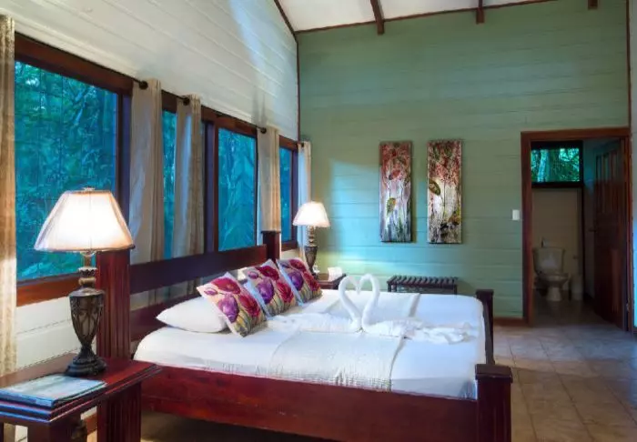 The lodge strives to create an experience as close to nature as possible, so there is no TV, radio or air conditioning in the rooms. The 56 rustic rooms are built in traditional Caribbean style with dark wood that blends naturally into the green surroundings. The en suite bathrooms offer a hair dryer and toiletries. There is a ceiling fan and window nets that provide a natural breeze and allow you to listen to the sounds of the rainforest as you fall asleep.