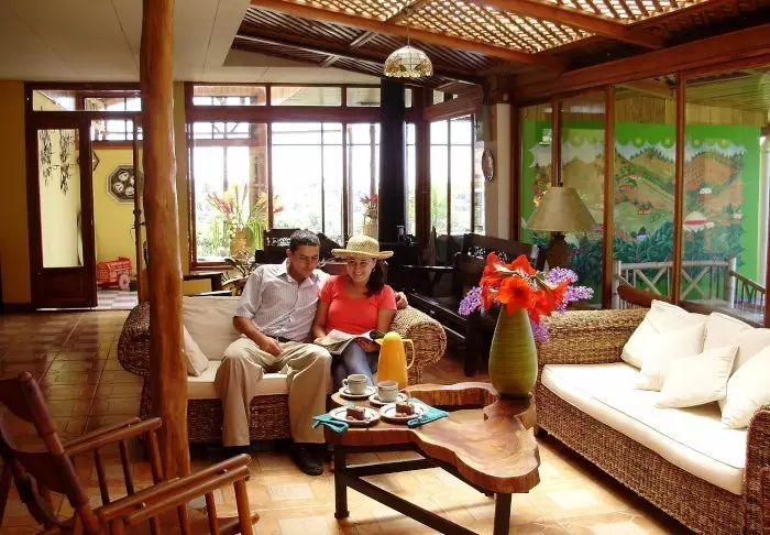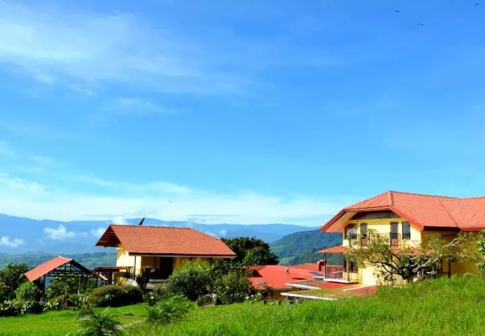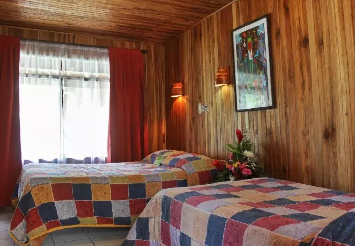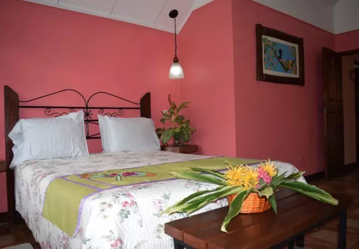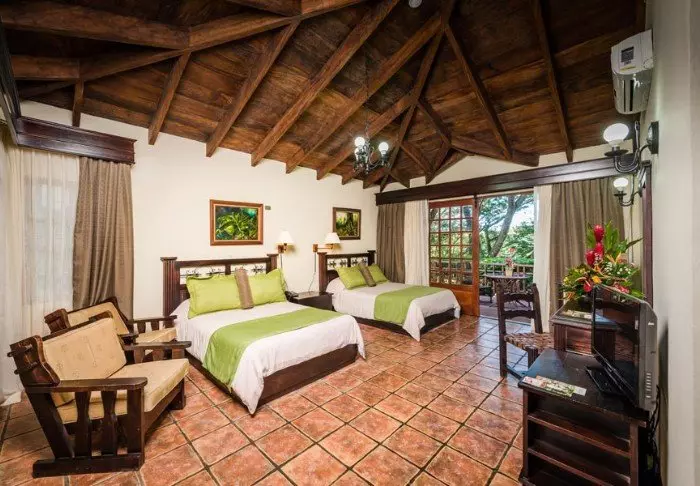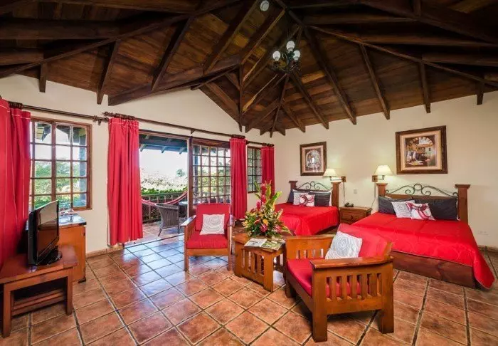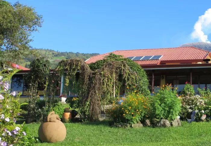 The lodge’s 28 rooms all have their own colour scheme and are decorated with folk art that harmonises with the nature around the lodge. Each room has an en suite bathroom with a hair dryer, toiletries and a hot water shower. The rooms all afford views of either Turrialba volcano or the valley.