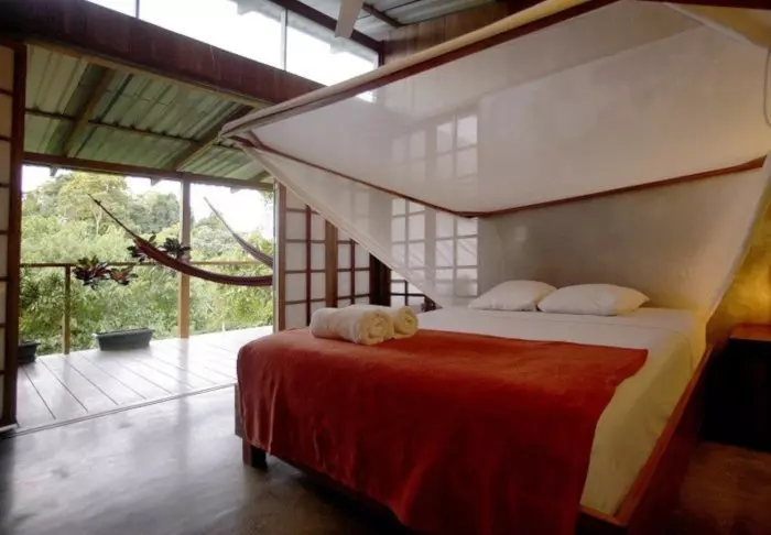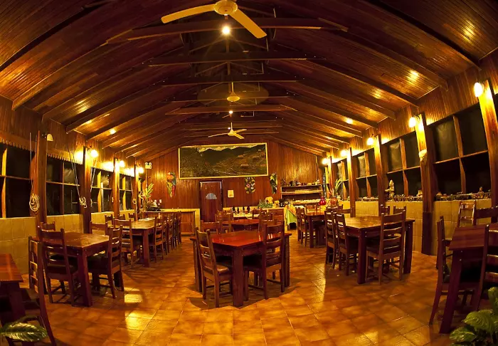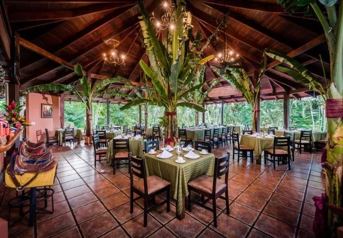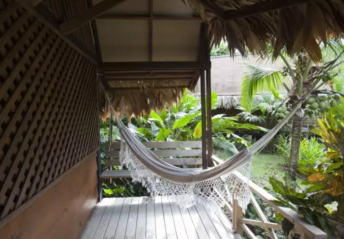 Its eight pleasant bungalows are located on small hills in the middle of the hotel’s hilly landscape and can each accommodate up to 4 people. All have ceiling fans, a safe, mosquito nets over the beds and an en suite bathroom with hair dryers and toiletries. Each bungalow also has a veranda with a couple of hammocks where you can relax after an action-packed day and enjoy the scenic surroundings. You may even be lucky to enough see parrots, toucans, hummingbirds or other exotic birds flying by.