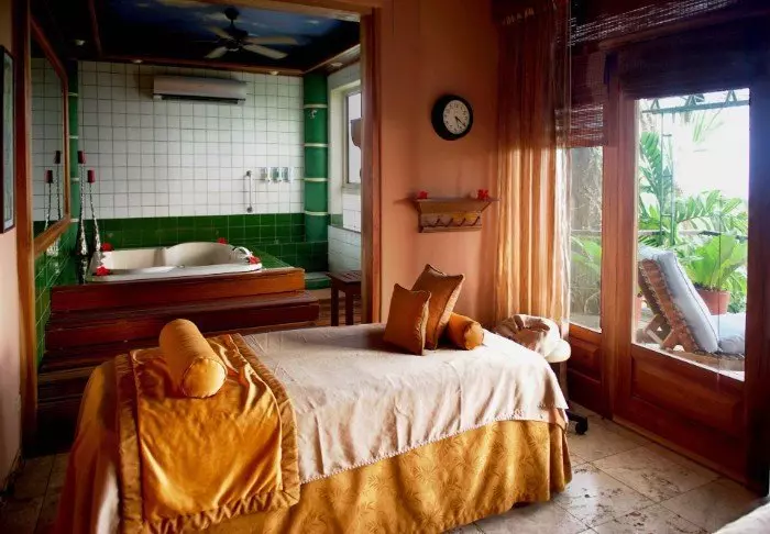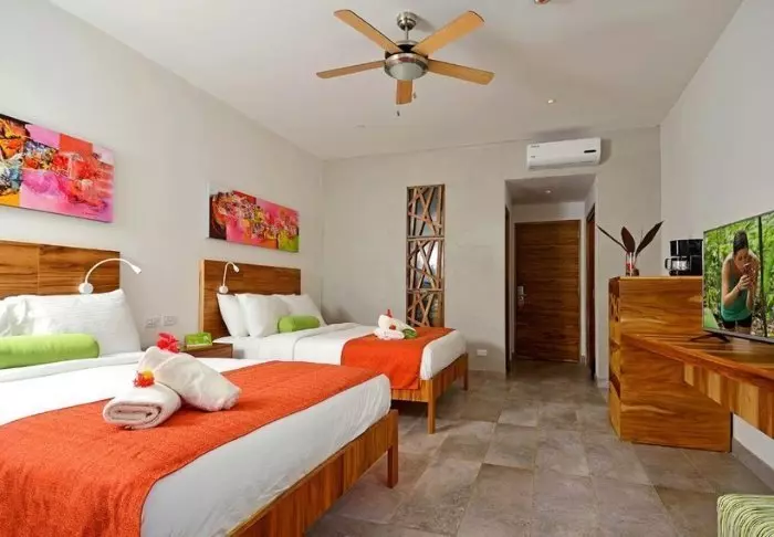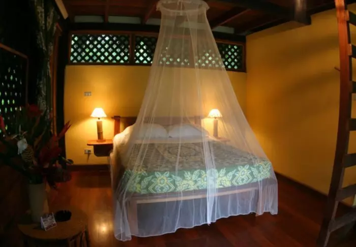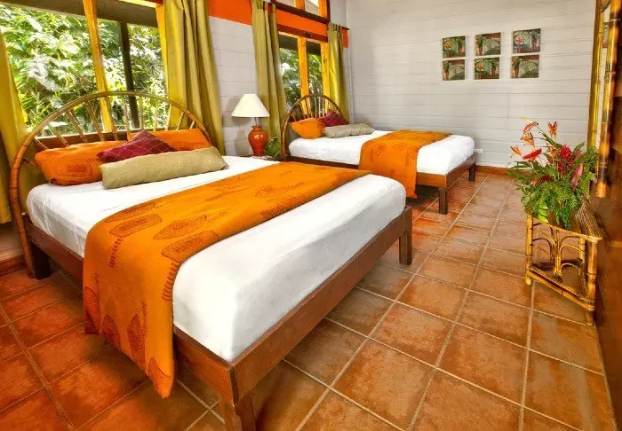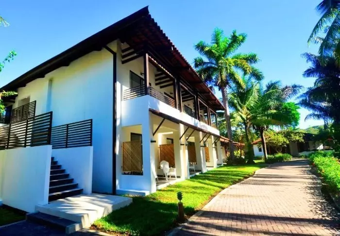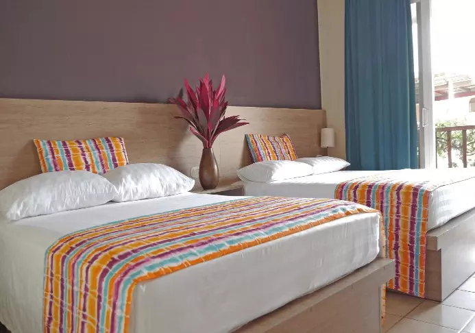 The lodge is set on a 34-hectare plot and has 94 rooms. The rooms are decorated in a tropical style with colourful cushions and pictures. All rooms have their own bathroom with hot water. There is a ceiling fan and nets on the windows, which provide a natural breeze in the room.