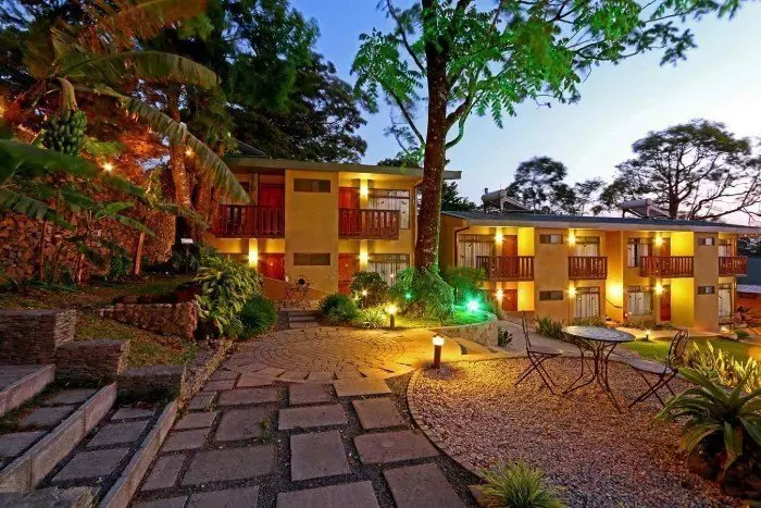 The lodge has 110 simply furnished rustic rooms, but all with their own toilet/shower, ceiling fan, safe and small terrace overlooking the lush garden.