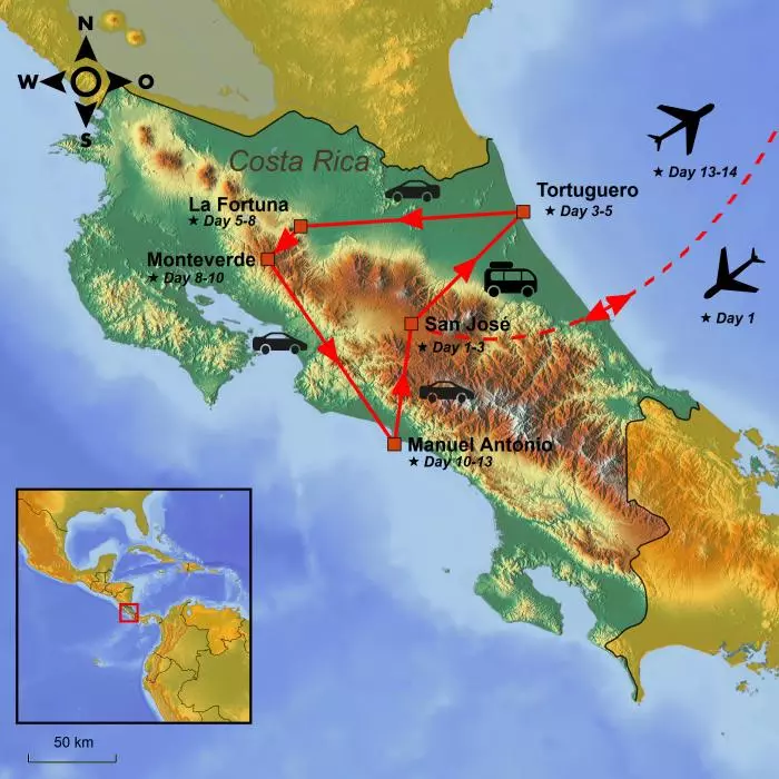Costa Rica, with its long sandy beaches, lush rainforests, cone-shaped volcanoes, hot springs and mysterious cloud forests, is a mecca for nature and animal lovers. On this tour, you have the freedom of your own car to experience the highlights of Costa Rica.