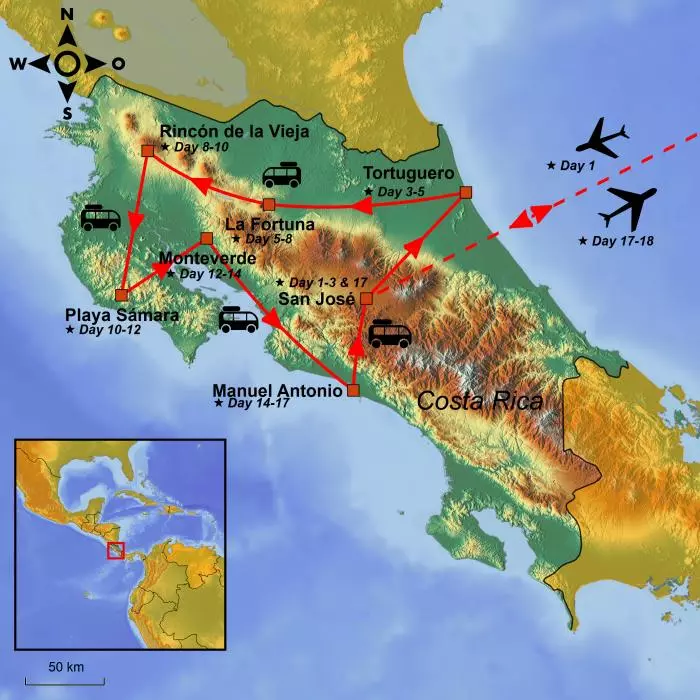 From Sámara, the tour continues up into the Cordillera de Tilarán mountain range, heading for Monteverde Cloud Forest. Monteverde is located at an altitude of around 1,400 metres, and the low cloud, which is almost trapped by the trees, provides moisture and thus life to the fantastic biodiversity of the rainforest and helps give the area its mysterious appearance.