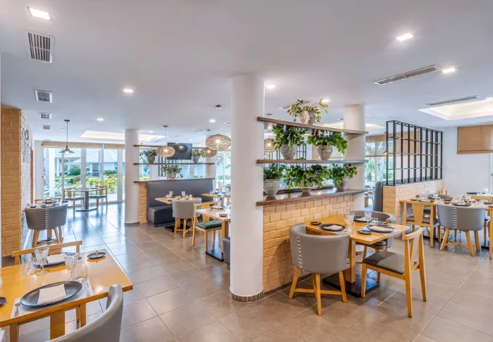 There are 393 rooms at the hotel, all of which are decorated in light colours. They are equipped with air conditioning, ceiling fan, TV, safety box and private balcony while boasting spectacular views of either the garden, the pool or the sea, which are all on the doorstep.