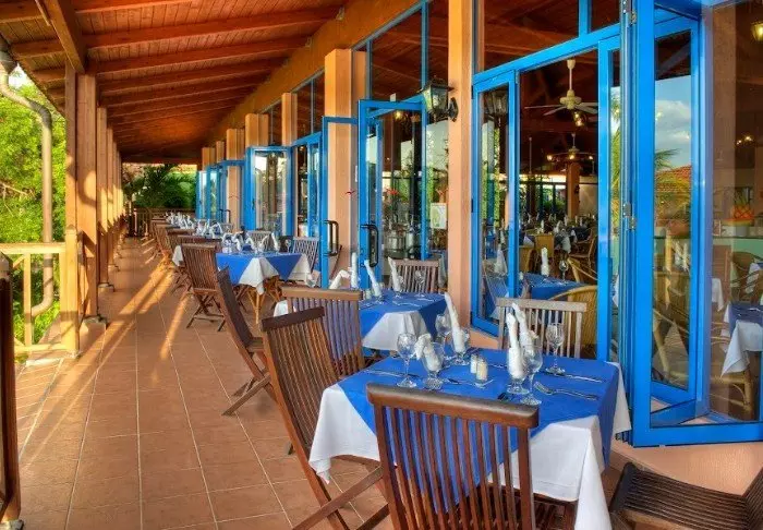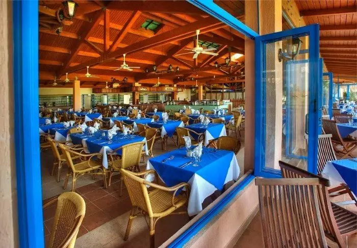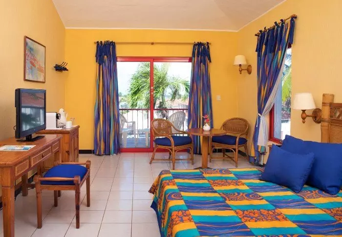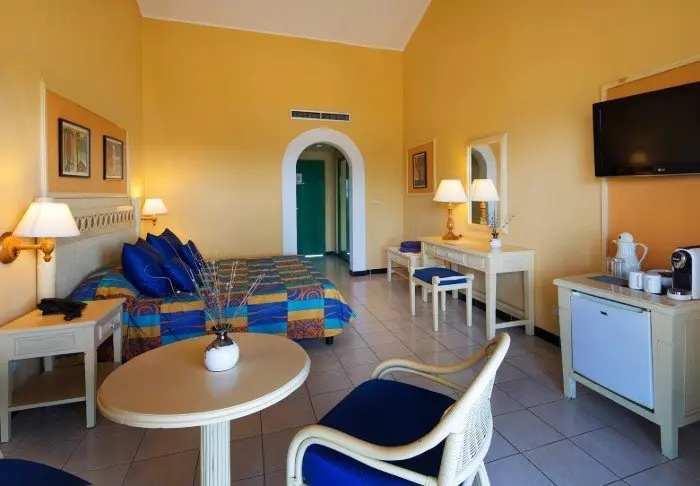 The hotel has 250 rooms and is an all-inclusive resort. All rooms have air conditioning, cable TV, minibar, safe, ironing facilities and a kettle for making coffee/tea. The rooms either have a terrace or a balcony. The rooms overlook the lush garden, but can be upgraded to a sea view or a view of the pool for an additional charge.