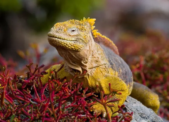 The landscape here is also bedecked with fig cacti and sesuvium edmonstonei, and you will also be able to see the greyish tree palo santo, the Spanish name of which means “holy wood”. You will see a lot of different bird species here, both land and sea birds, and not least the Santa Fé land iguana.