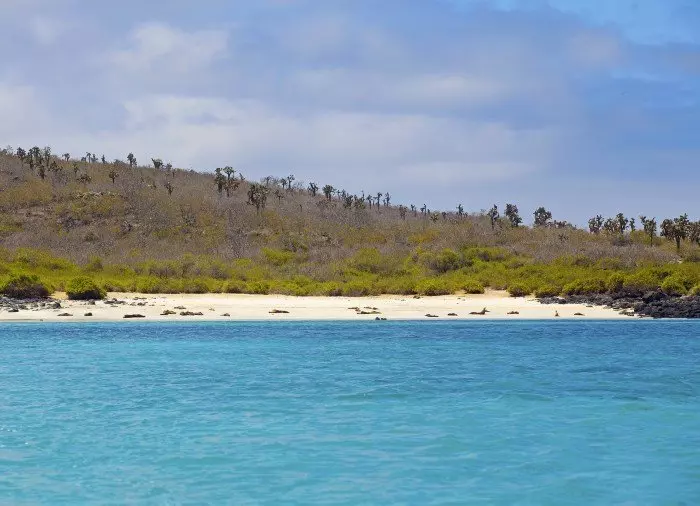Santa Fé is located south-east of Santa Cruz, and from Puerto Ayora, you have a 1.5-hour boat ride out to the island, where you will be welcomed by a large sea lion colony on the white sandy beach.