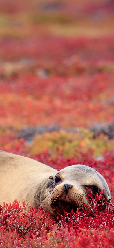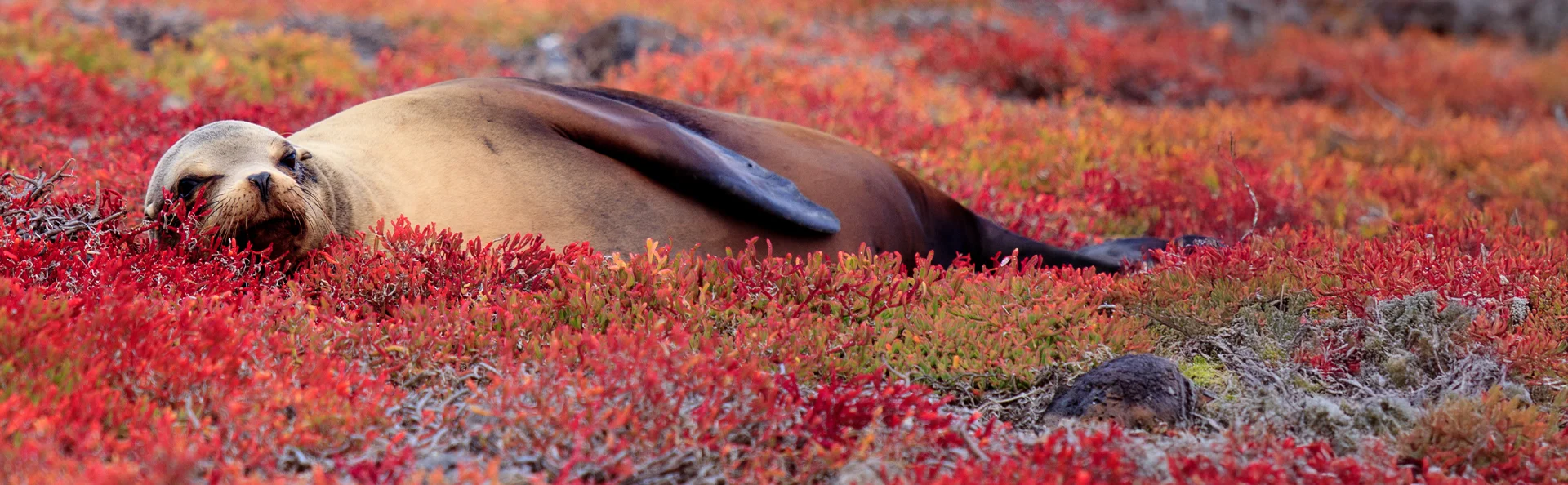 Pretty much everywhere you look on South Plaza, you will be able to see fig cacti as well as the plant sesuvium edmonstonei, which can only be found on the Galapagos Islands. In the shadow of a fig cactus, you may perhaps spot a land iguana waiting for the fruit of the cactus to drop to the ground, as the island is also a habitat of land iguanas. At the water’s edge, you have a chance of seeing sea lions and seabirds like, for example, red-billed tropicbirds and dovetail gulls.