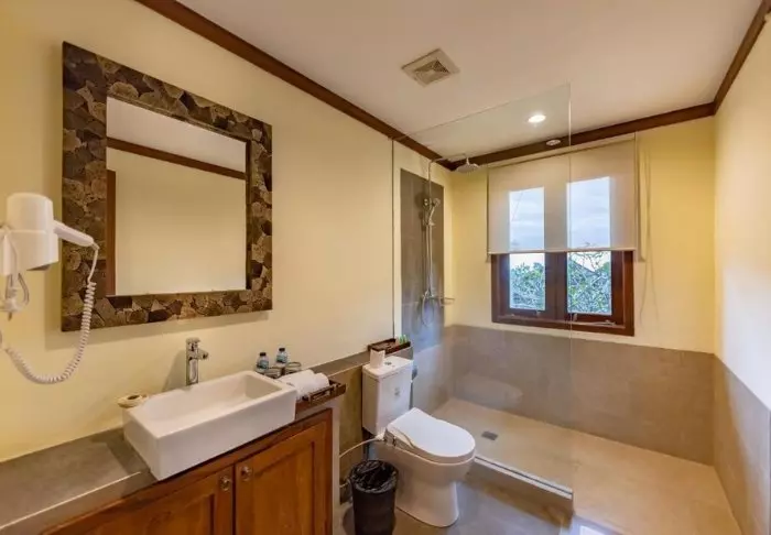 Vila Ombak has a total of 148 spacious and tastefully appointed rooms with classic wooden furniture and Indonesian art. All have Wi-Fi, air conditioning, a safe, a mini-fridge, a TV, a telephone, complimentary bottled water and an electric kettle, allowing you to start the day with a cup of coffee or tea, which you can enjoy on your private balcony or terrace. All rooms also feature their own large bathroom with complimentary toiletries and a hair dryer.