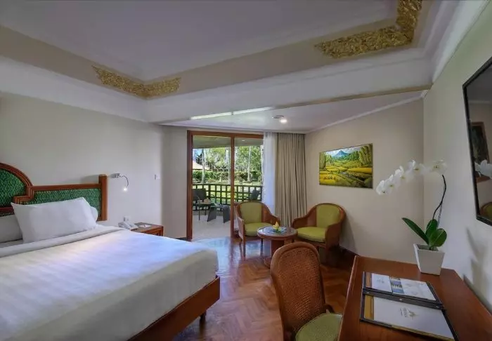 Your stay includes a Wisma Seni Superior room as standard – the resort’s latest room category. Elegantly decorated in Balinese style and nestled among verdant rice fields and an organically shaped swimming pool, the room is bright and spacious, featuring air conditioning, a TV, a safety box, and Wi-Fi. A private balcony complete with table and chairs invites you to unwind as you take in the views of the green surroundings. The bathroom is designed in authentic Balinese style with a separate toilet, wash area, and shower cubicle.