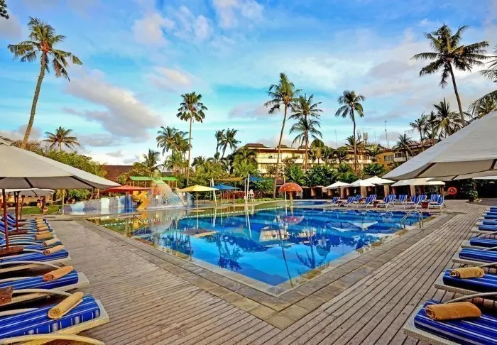 There is a lovely pool area with children’s pool, sun loungers and parasols as well as a small playground for children. When hunger strikes, the hotel has two restaurants to choose from: Balimoon and Sea Food Grill. The hotel also has two bars where you can grab a cold drink to quench your thirst. If you fancy a massage or other wellness treatments, these can be purchased at the hotel day spa.