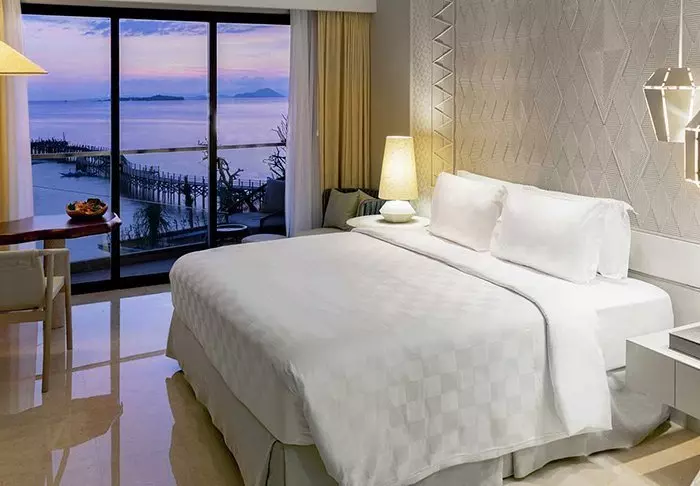 The resort’s 205 rooms are stylishly furnished, with modern décor in light colours that perfectly compliment the inflow of natural light from the large windows. Each room measures at least 43 m2 and has its own private balcony from which you can enjoy the fantastic sea views and the golden colours of the sunset. In addition, all rooms have air conditioning, Wi-Fi, an LED TV, a walk-in closet, a minibar and coffee/tea making facilities. The bathroom has a hair dryer and a separate rain shower and bath.