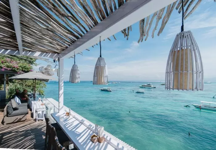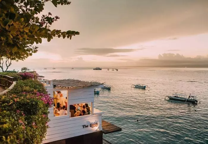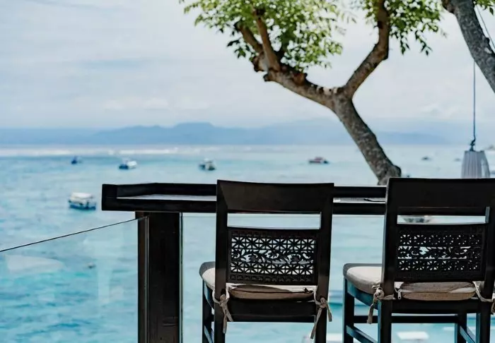 Batu Karang Lembongan Resort is located on a coral slope above Jungut Batu Beach, overlooking Badung Strait and the magnificent volcano Mt. Agung in Bali.