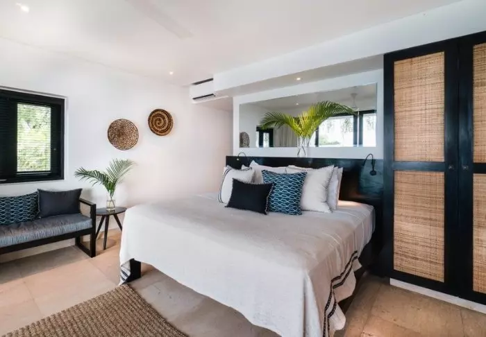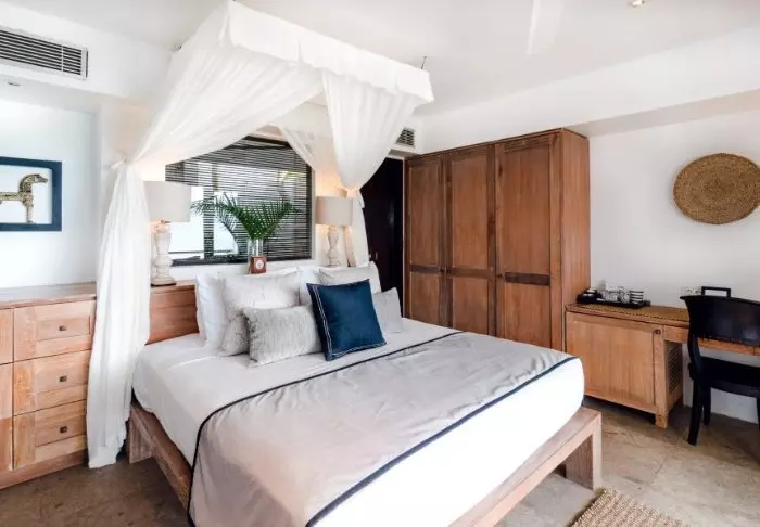 The room categories range from double rooms of 45 m2, several of which have a private plunge pool, to a 3-room villa of 300 m2. All room categories offer air conditioning and a ceiling fan, a mosquito net over the bed, a TV, a telephone, internet, a minibar, coffee and tea making facilities, an iron and ironing board, bathrobes and a hair dryer. There is also an outdoor bath and shower.