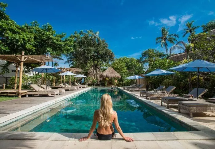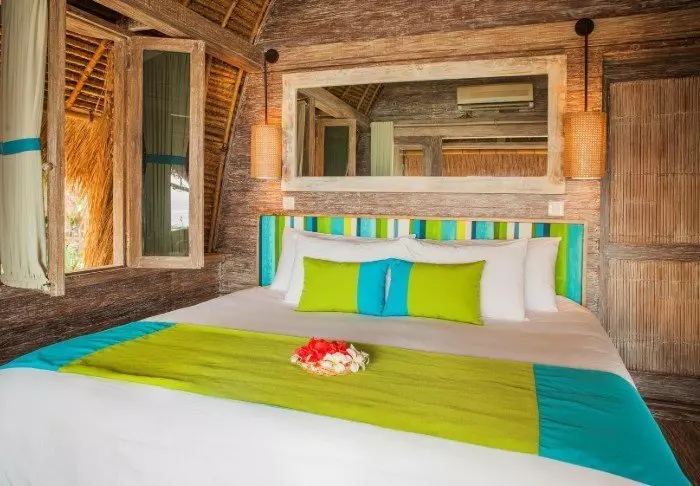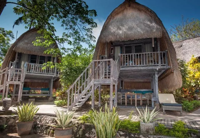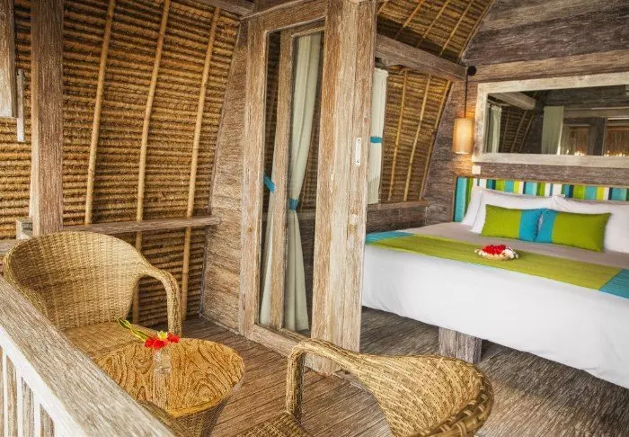 You will be staying in the middle of the hotel’s lush garden between palm trees and beautiful tropical flowers in one of the 18 thatched bungalows known as a “lumbung”, which was originally an old-fashioned rice barn. On the ground floor, you have a small private outdoor area where you can relax and sit in the shade, and on the first floor, there is a bedroom with mosquito nets, air conditioning, a fridge, free bottled water, a safe, tea and coffee making facilities and a bathroom with a hair dryer. There is also a small balcony with a table and chairs.