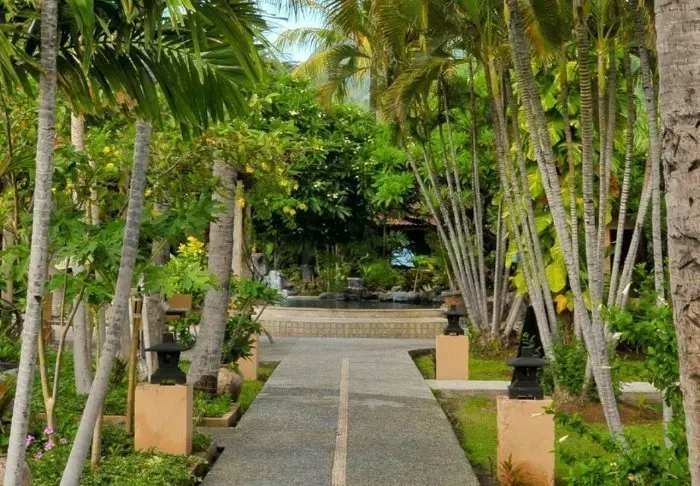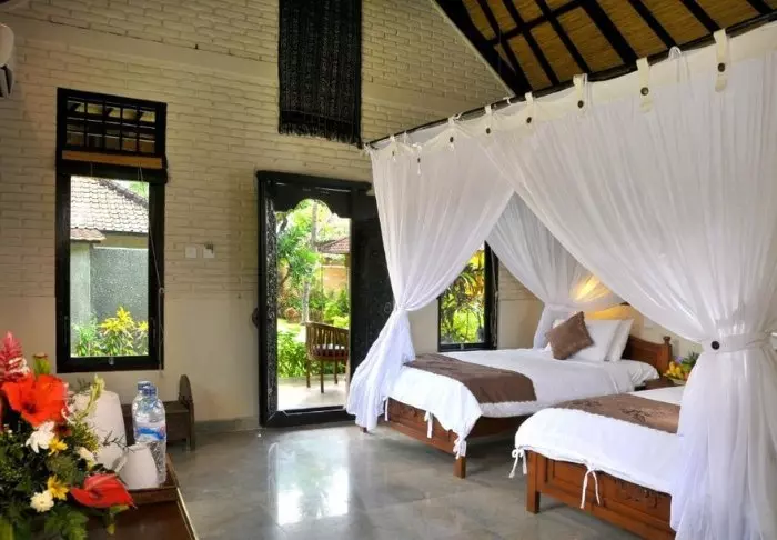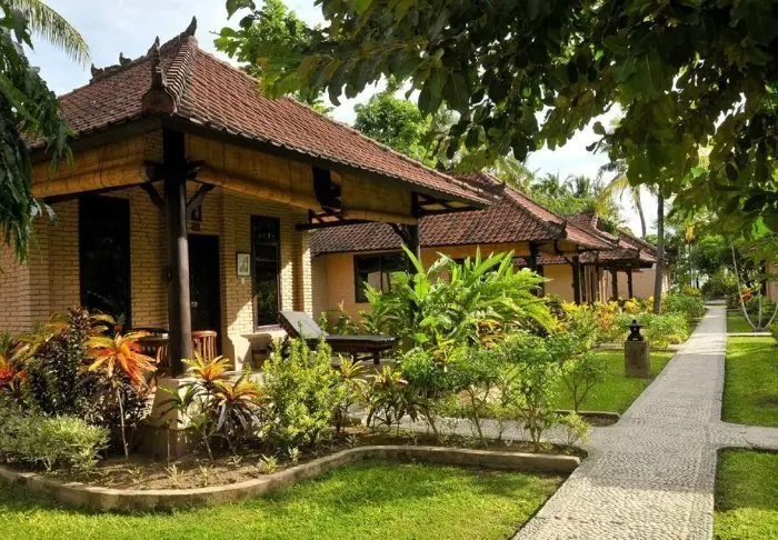 The small hotel is built in traditional Balinese style with natural materials that beautifully complement the green surroundings.
