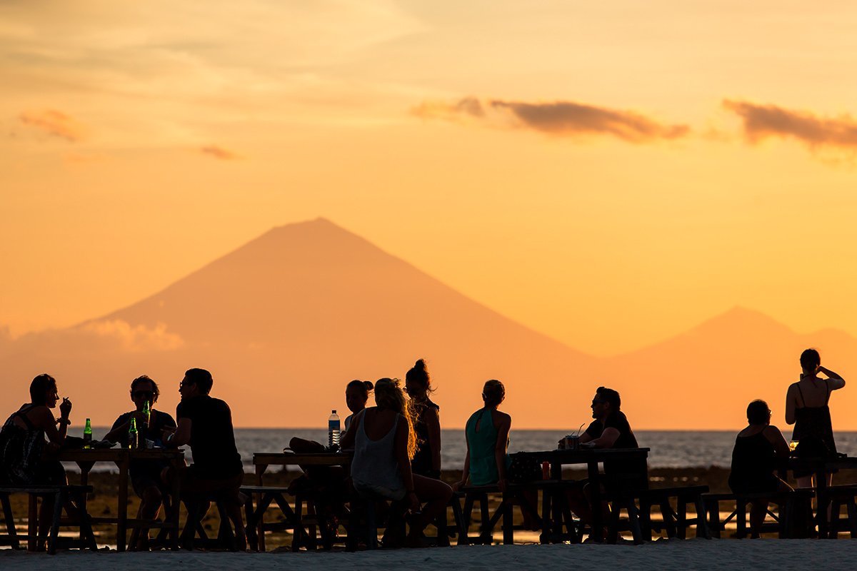 During the day, the atmosphere is relaxed, with things livening up in the evening at the numerous small restaurants and bars. On the west side of the island, you can enjoy the beautiful sunsets over Bali, and if you’re lucky and it’s a clear evening, you’ll even be able to see the sun go down behind Mt. Agung.