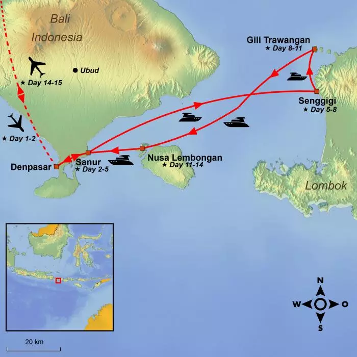 You start in Bali in the popular resort town of Sanur, which is famous for its relaxing, cosy atmosphere, not to mention its many kilometre-long golden sandy beach. After a day in the sun on the beach, you can relax at one of the town’s cosy cafés or popular lounge bars and soak up the atmosphere.