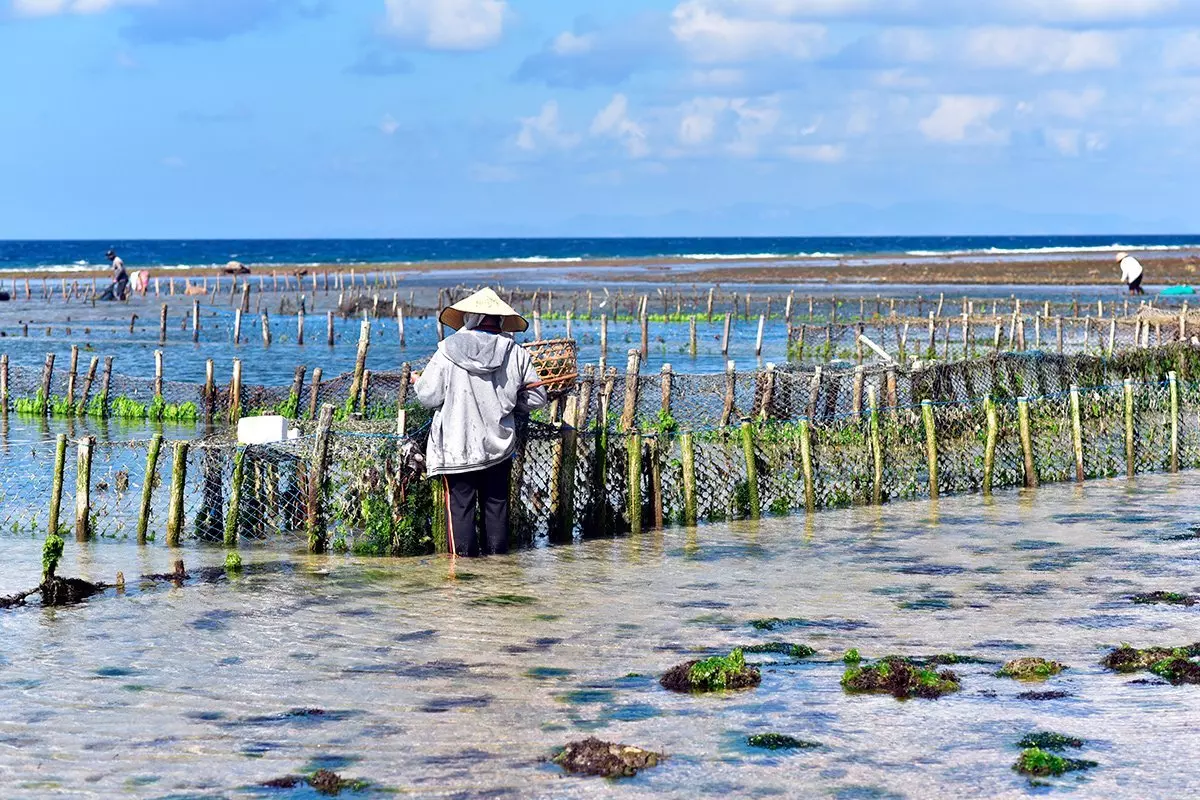 Many of the island’s inhabitants sustain themselves by growing seaweed. When the tides recede, the seaweed fields emerge, and you can see the farmers stream out into the ankle-deep water to pick the day’s harvest. They place it in big woven baskets and carry it back to shore to dry it in the sun.