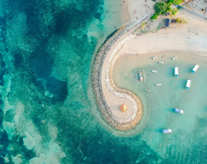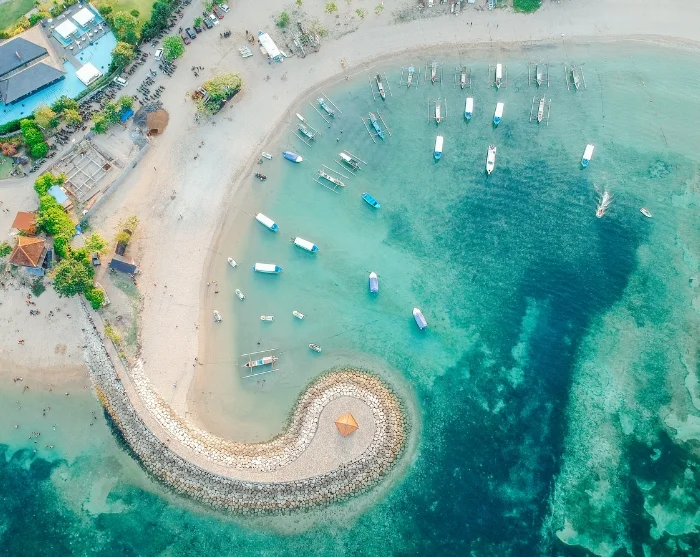 As evening falls, you can watch the sunset from the beach. Here, the sea mirrors the sky while palms, colourful fishing boats, and the little pavilion at the water’s edge create an atmosphere that captures the essence of peaceful Sanur.
