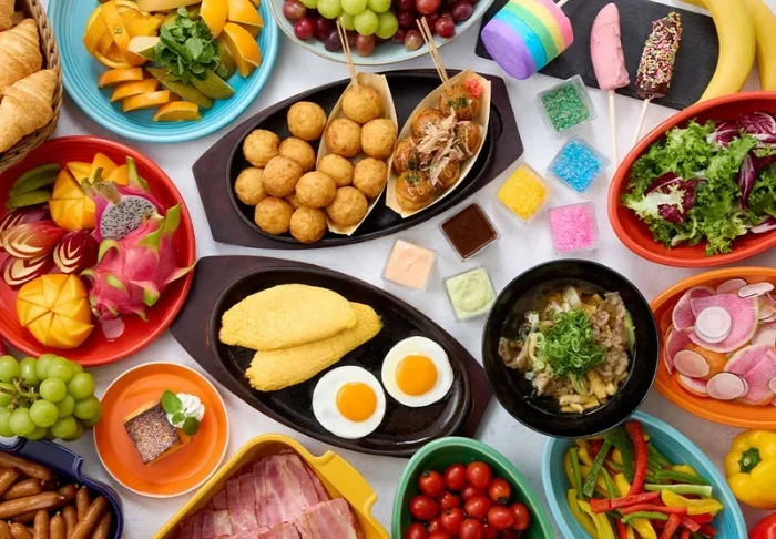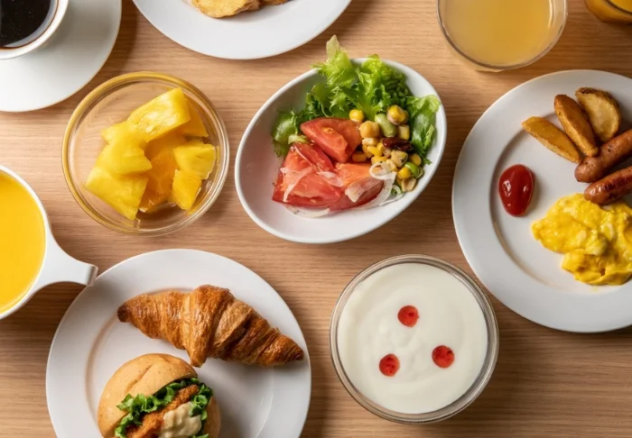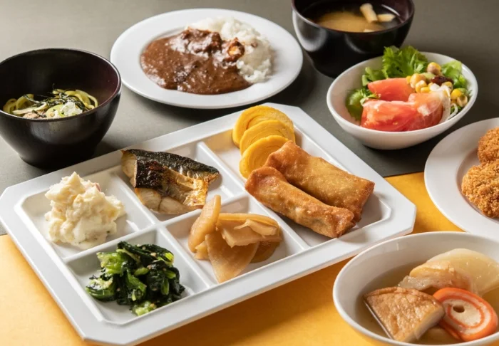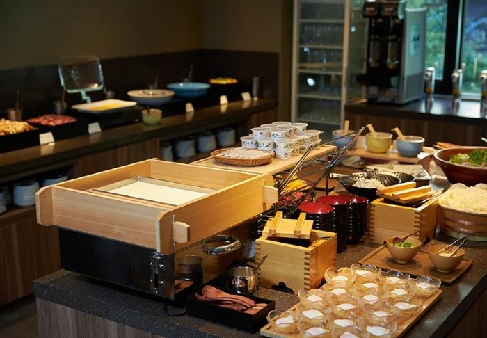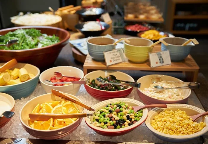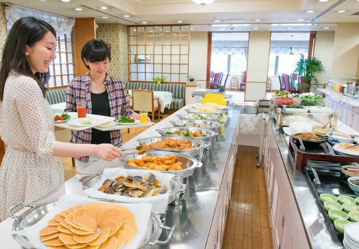 A breakfast buffet is served in the hotel restaurant with both Japanese and western dishes.