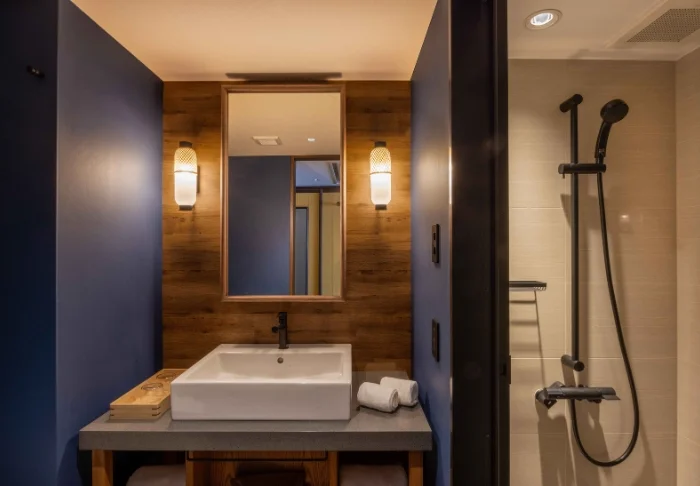 You’ll stay in a Standard Room featuring soft lighting and a carefully balanced colour palette. The bespoke bed provides extra comfort, and the bathroom is equipped with a separate shower area, washbasin, and toilet. Additional amenities include air conditioning, WiFi, a TV, a mini-fridge, a kettle with a Japanese tea set, a safety box, a hairdryer, as well as a well-chosen selection of toiletries, a yukata robe, and slippers.