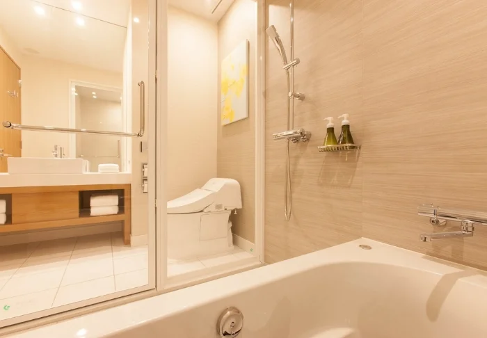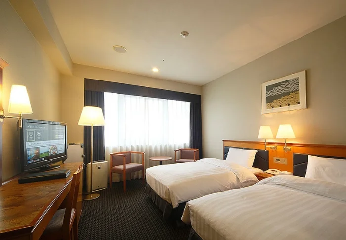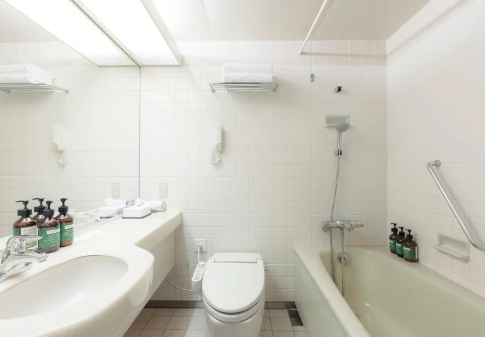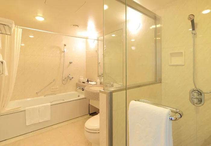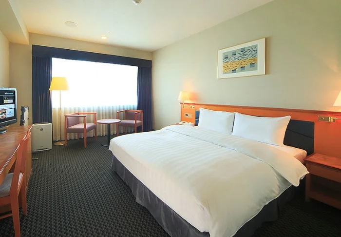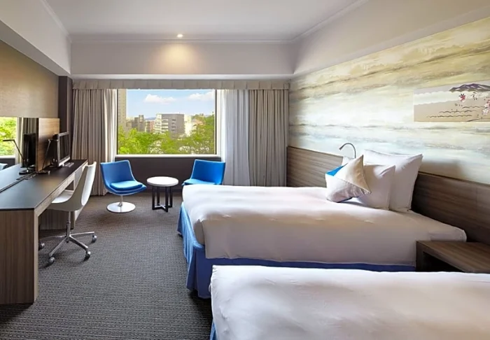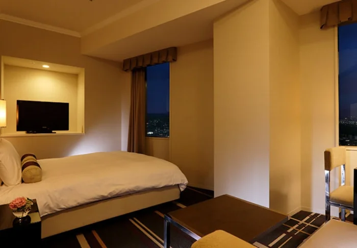 During your stay, you will be accommodated in a spacious Standard Room on the 17th floor or higher, where you can enjoy views of either the mountains or the sea. The room is decorated in an inviting style with soothing tones and a high level of comfort. You’ll have complimentary access to WiFi, a TV, air conditioning, coffee and tea facilities, a mini fridge, and a safety box. The bathroom features both a bathtub and a shower, a washlet toilet, a hairdryer, slippers, and a fine selection of high-quality toiletries.