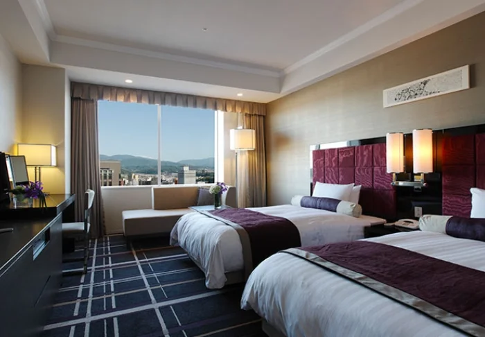 Your stay includes a spacious room with European-inspired décor and soft, muted tones that create a calm and relaxing atmosphere. The room features comfortable beds, air conditioning, a TV, a minibar, Wi-Fi, tea and coffee-making facilities, and a small writing desk. The bathroom comes equipped with a hairdryer, toiletries, bathrobe, slippers, and a bathtub with a shower.