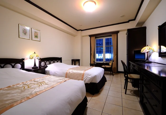 Your stay includes a spacious Standard Room decorated in graceful Art Nouveau style, featuring beautiful details and a serene ambience. You’ll enjoy modern comforts such as air conditioning, Wi-Fi, a TV, a minibar, tea and coffee-making facilities, a desk, and slippers. The bathroom is fitted with a washlet toilet, a bathtub with a shower, a hairdryer, and a selection of high-quality toiletries.