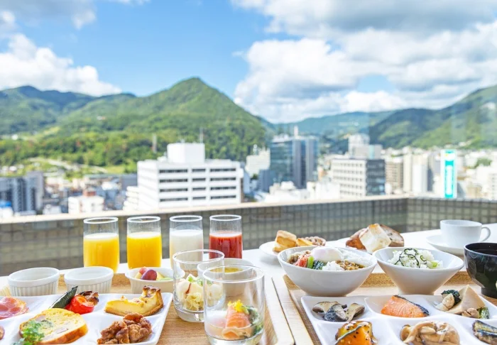 Without doubt, one of the hotel’s main highlights is the restaurant on the top floor, where a spectacular panoramic view of the city and mountains unfolds in a kaleidoscope of colours that changes with the seasons. Here, you can look forward to an inviting breakfast buffet combining seasonal local produce with delicious flavours from both Japanese and international cuisine.